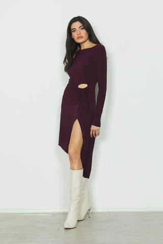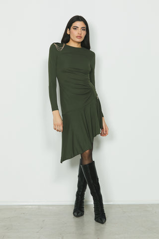 Abito ANTONELLA midi manica lunga con taglio più catena sp. più pieghe fianco più balza asimm.
