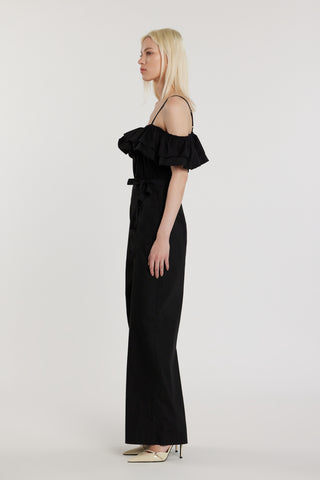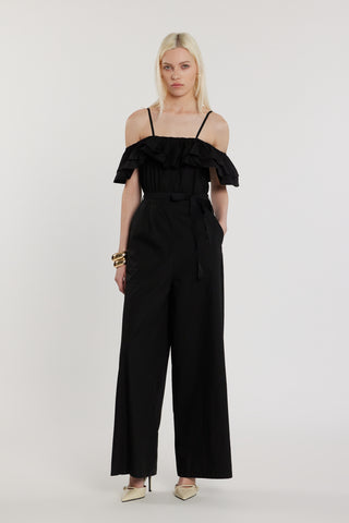 Tuta STRAUX lunga maniche lunghe scollo barca più bretelle con balze più cintura con nappe