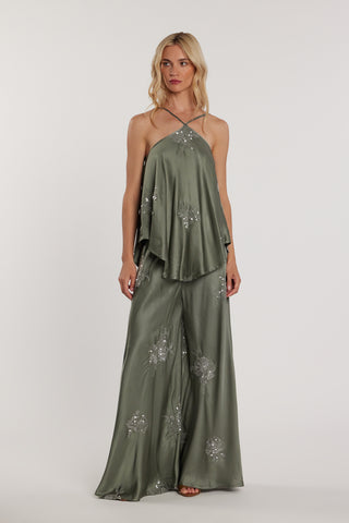 Tuta BELLYSA con top più Pantalone vita alta palazzo raso più ricamo fiori paillettes
