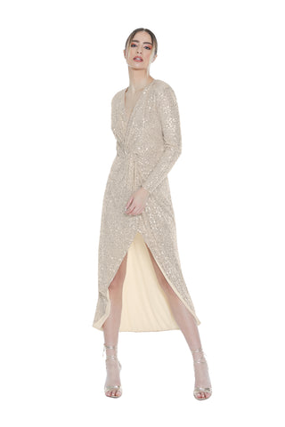 Abito BEID lungo manica lunga scollo v con incrocio più nodo più spacco full paillettes