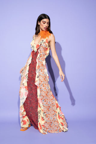 Abito PEACOCK lungo con spalline più rouches stampa fiori multicolor