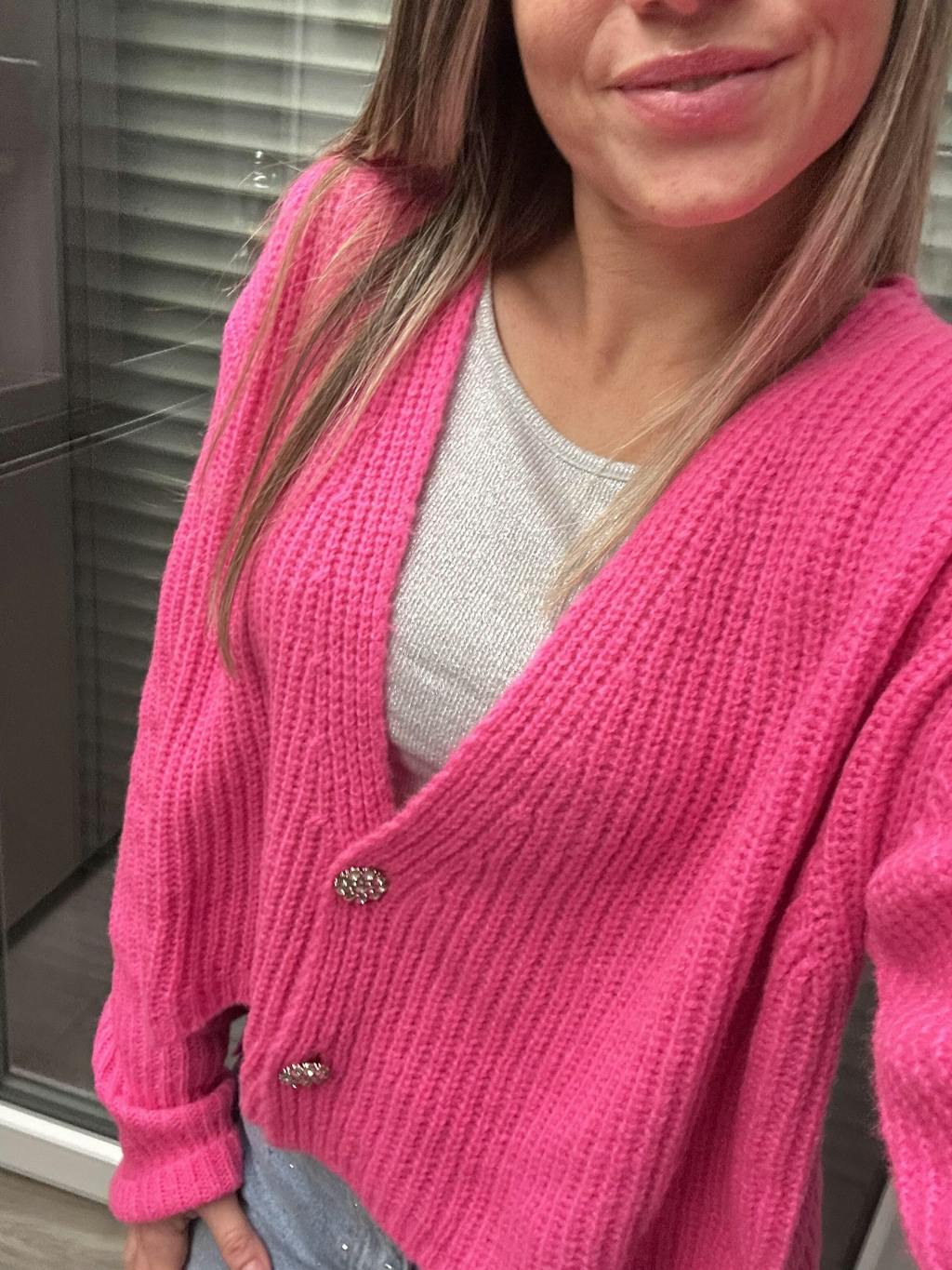 Preso nel colore fucsia, bellissimo, bottoni gioiello che lo rendono ancora più luminoso. Vestibilità morbida. Non può mancare nell armadio