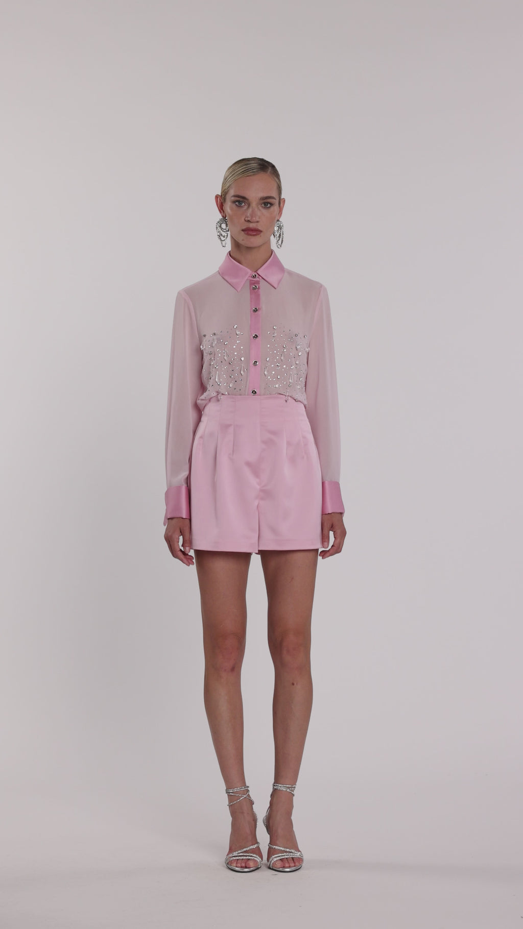 Eleganza pura: inserti in raso sulle maniche, gemelli scintillanti e applicazioni in strass con pendenti rendono questa camicia il capo perfetto per brillare in ogni occasione speciale.