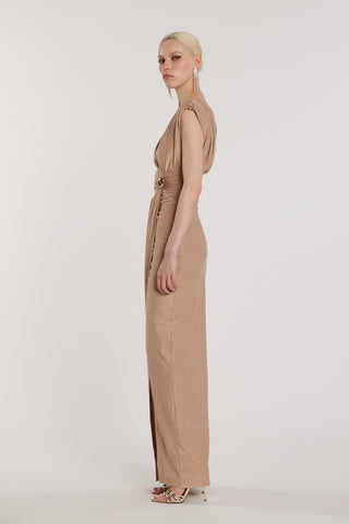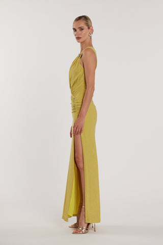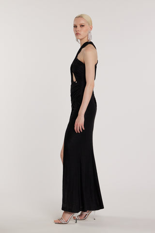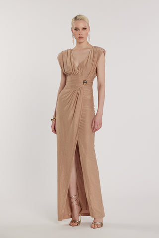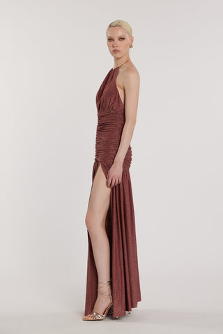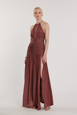 Abito GARKO lungo scollo a V profondo più spacco più arricciatura più accessorio collana lurex