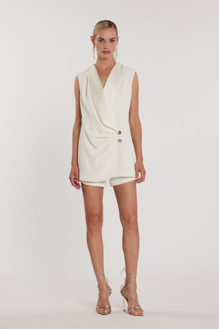 Tuta Marisett corta senza maniche collo in raso più drappeggio con arricciatura e bottoni
