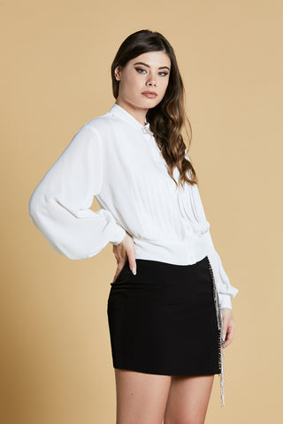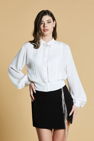 CAMICIA MOUS corta con manica lunga palloncino collo koreana con pieghe più spilla strass
