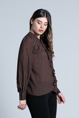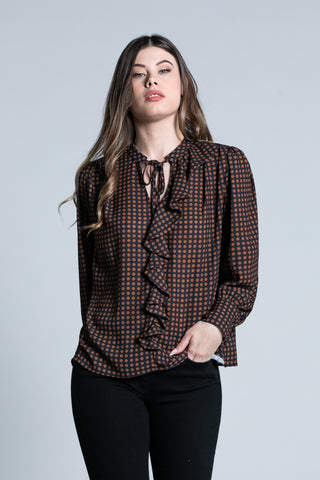 Blusa OTYS manica lunga collo koreana più nastrino più goccia più volant pois