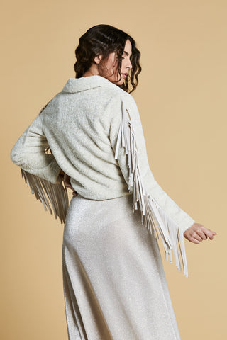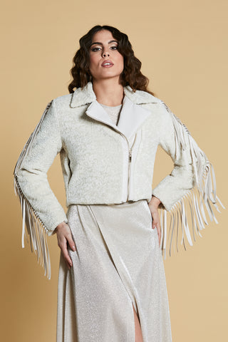 Pelliccia NESU eco corta manica lunga chiodo con inserti ecopelle più frange