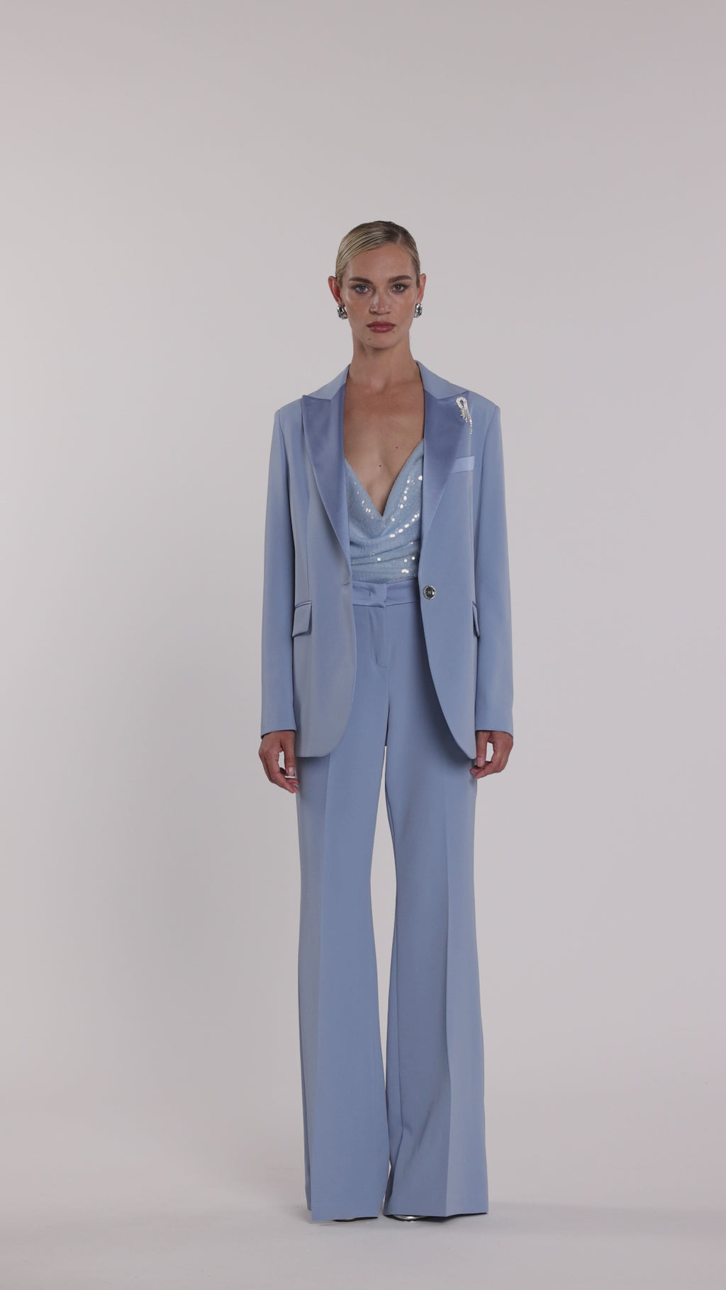 Pantalone Barrinton vita alta a zampa con inserti in raso luminoso, un capo che unisce struttura e fluidità con grazia. La gamba a zampa allunga la figura, mentre gli inserti in raso aggiungono un dettaglio couture sofisticato. Ideale per serate glamour o eventi esclusivi, conferisce eleganza e movimento armonioso, valorizzando ogni passo con un tocco di femminilità raffinata.