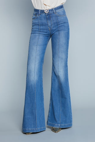 Jeans TRACY_B Vita Alta con Cintura più Fibbia Logo 5 Ts con Impunture Zampa Denim