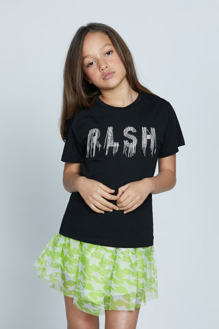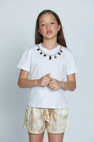 T-shirt EMIKO mezza manica con scritta rlsh strass più catene pendenti