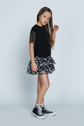 Abito PRIMULA corto mezza manica frange più stampa relishcon balze tulle stelle