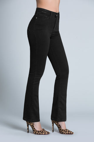 Jeans KOI vita alta zampa fondo sfrangiato denim