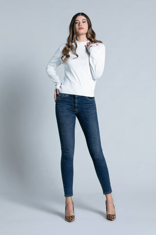 Pantalone jeans 5 tasche vita alta con profili in gros grain e strass sul fondo in denim colore blue scuro SVEVA