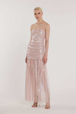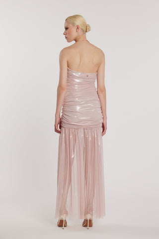 Abito CATHERY lungo smanicato con arricci più balze più inserti pizzo