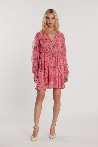 Abito COLBERT corto maniche lunghe con apertura più rouches scollo a V con bottoni più coulisse fantasia rose