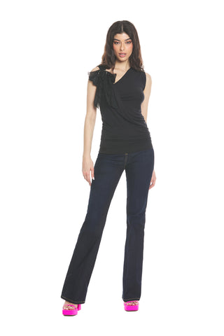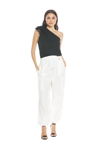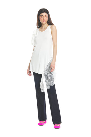 T-shirt HYDRA lunga mezza manica monospalla con inserti pizzo più georgette più piuma