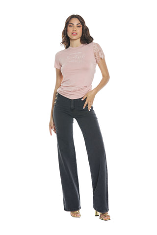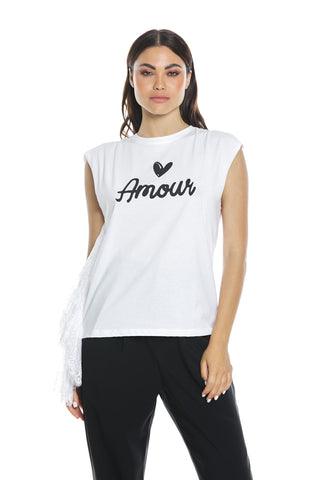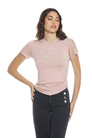 T-shirt AMMOR mezza manica aletta con arricci più stampa più inserto pizzo