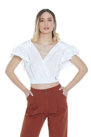 Blusa OTSUKO corta mezza manica rouches doppio scollo incrocio con elastico fondo