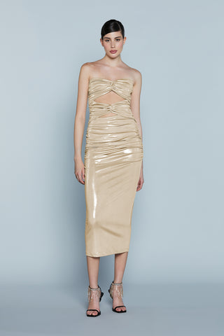 Abito TROPICA Midi Fascia Cut-Out con Arricci più Nodo Spalmato Lurex
