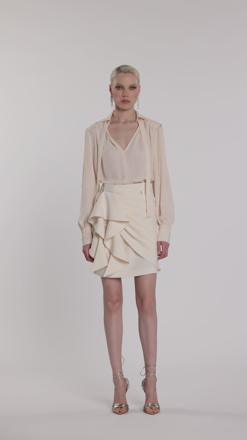 Eleganza in movimento: questa blusa presenta una scollatura a V sofisticata e maniche lunghe raffinate, completata da una fusciacca che valorizza al collo. Le frange decorative aggiungono dinamismo e stile, trasformando ogni gesto in un piccolo spettacolo. Perfetta per look da sera o eventi speciali, è il capo ideale per chi vuole distinguersi con charme e personalità.
