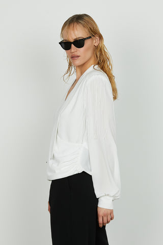 Blusa SANTORINI manica lunga scollo a v incrocio più cravattino più frange spalle