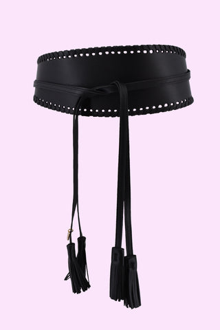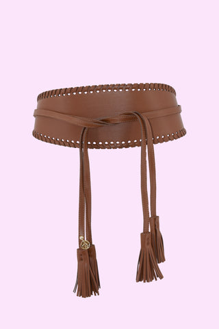 Asymmetric RANDY belt with woven edges plus laces with eco-leather pendants