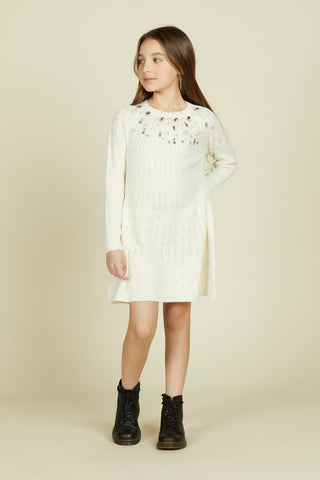 TESEA short, long-sleeved, flared dress with pearl and cabochon applications