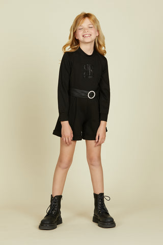 Short RABBIT jumpsuit with long sleeves and relish logo plus rhinestone buckle belt