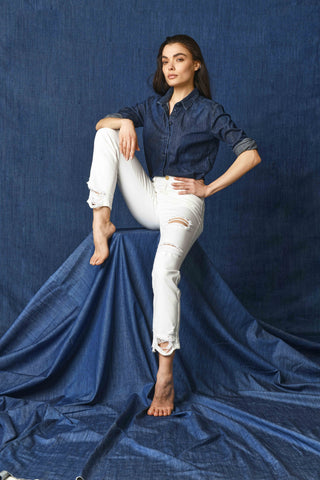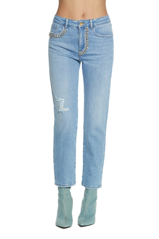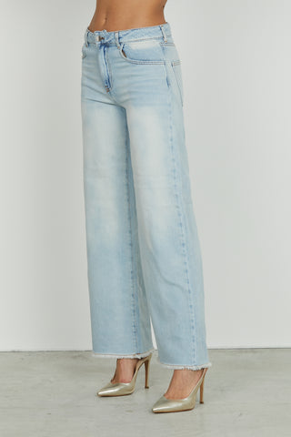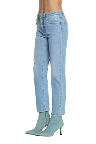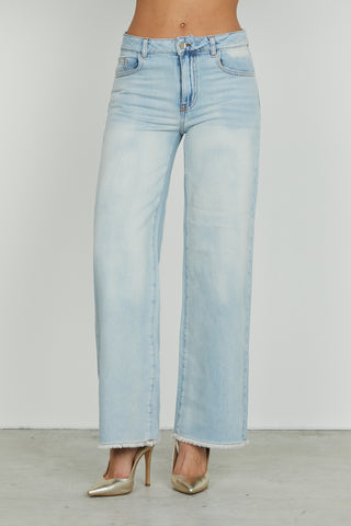 ELLE_22 medium waist 5 pocket trousers with straight fit blue denim fringed hem