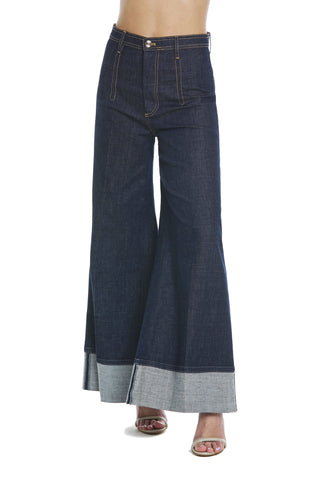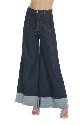 SIGGY high waist trousers with stitching details on blue denim palazzo leg