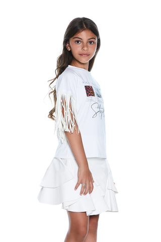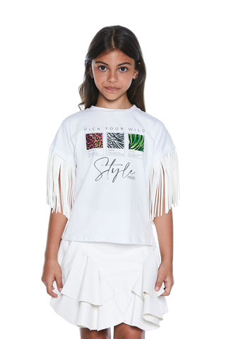 WILD half-sleeved t-shirt with print and eco-leather fringes