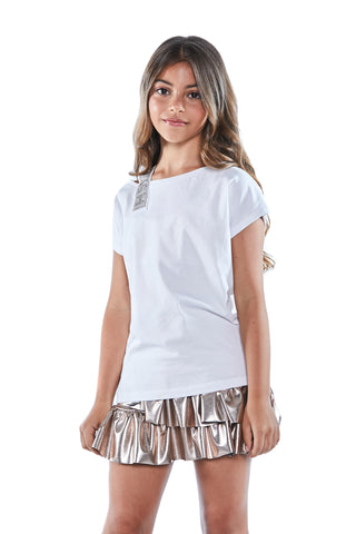 SHILERINA half-sleeved t-shirt with rhinestone appliqué plus taffeta ruffles plus internal logo print