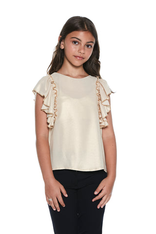 GOLDEN half-sleeved ruffle blouse with bow on the back, coated georgette