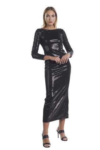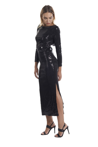 Long fitted dress with long sleeves, back neckline and slit in full black sequins by SCIANTIX