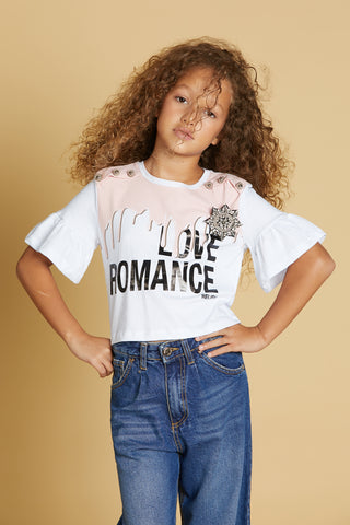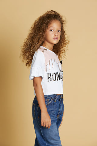 APUS short s/m ruffle t-shirt with print plus shoulder buttons and rhinestone brooch