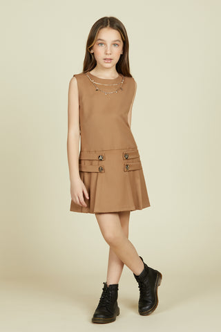 AMERICAN short sleeveless dress with pleats and martingale with buttons and necklace