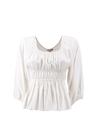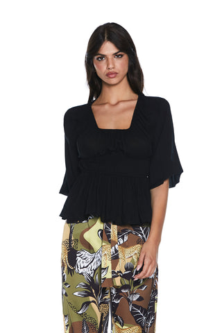 OPTIUR crop-top with wide 3/4 sleeves and ruffle and flower pattern smocking