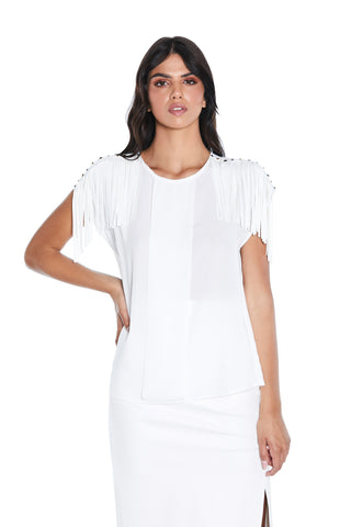 LEA half sleeve blouse with fringes and studs with pleat and drop back