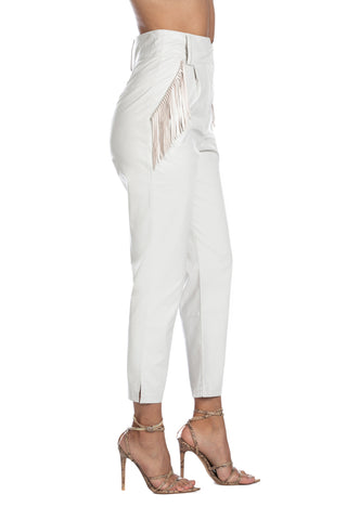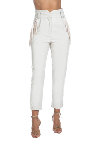 LUCANIA mid-rise faux leather trousers with French pockets and fringes