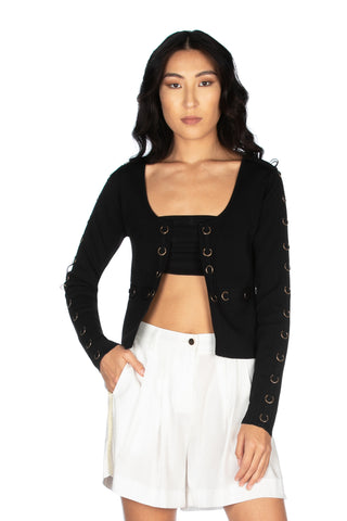 Short, long-sleeved JACK cardigan with gold rings and fabric inserts