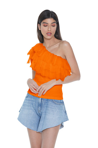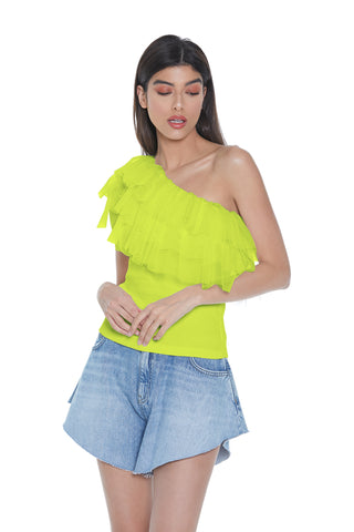 RIKU one-shoulder half-sleeve t-shirt with tulle