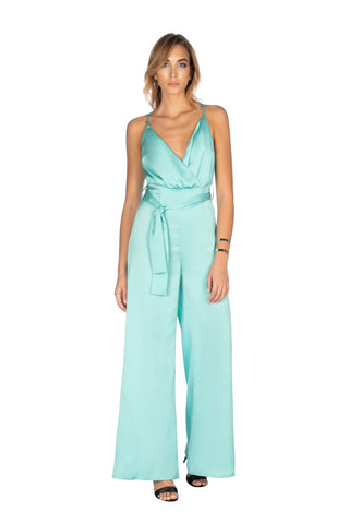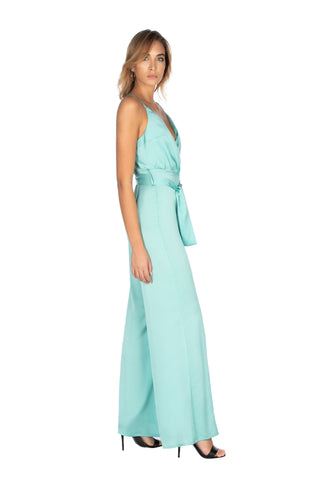 NEVERMAI sleeveless jumpsuit with crossover neckline and palazzo belt